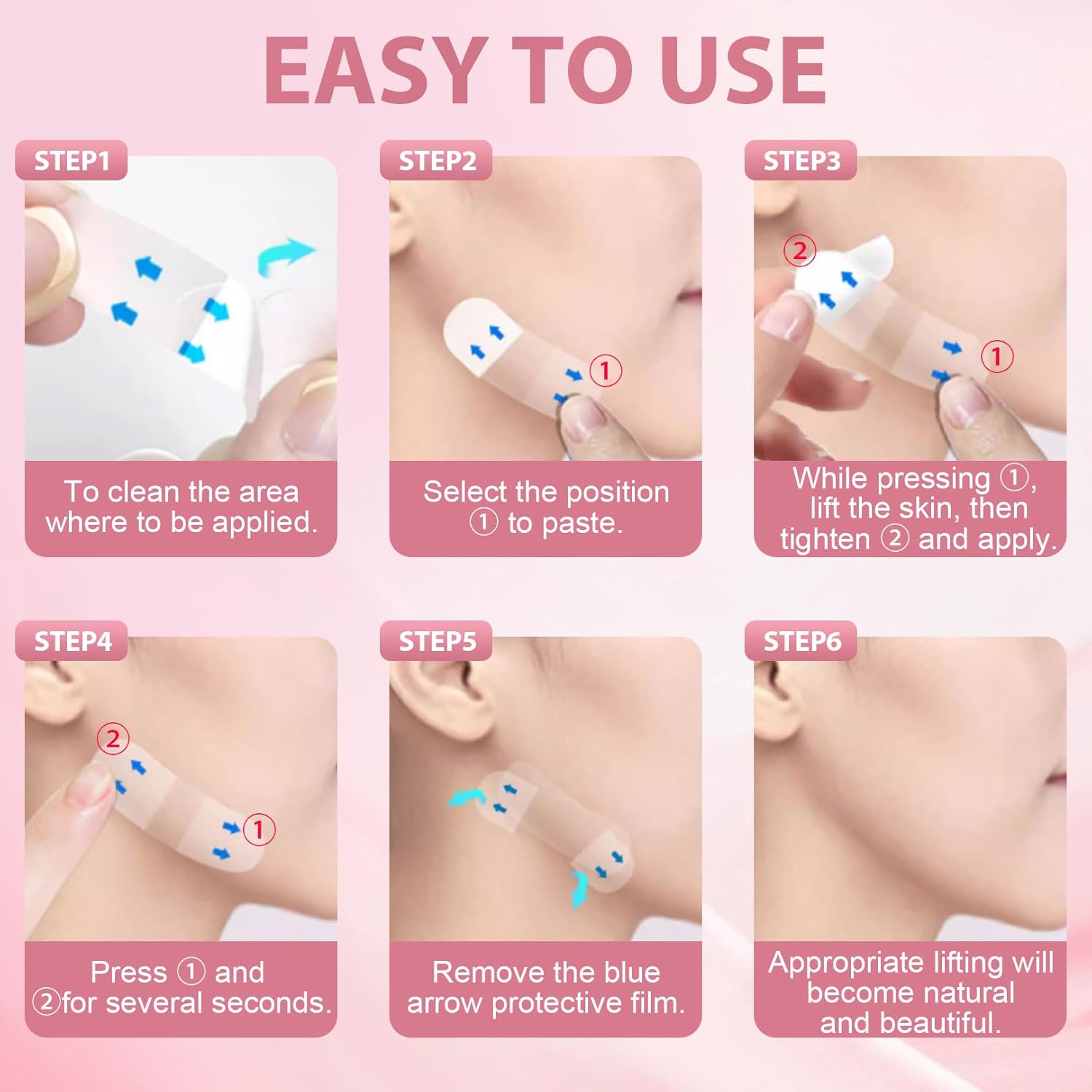 【Enkel å bruke】 【Lett å bruke Bare påfør den ene enden av ansiktsløftningsteipen på huden din, trekk deretter huden 1 - 2 inches tilbake og trykk fast oppover for øyeblikkelige resultater! Sørg for at ansiktet ditt er fritt for sminke eller olje før du påfører ansiktsløftningsteipen usynlig. Som en vennlig påminnelse vil det gjøre litt vondt når du trekker den av, så du kan varme eller myke den opp med en sminkefjerner før du fjerner den.