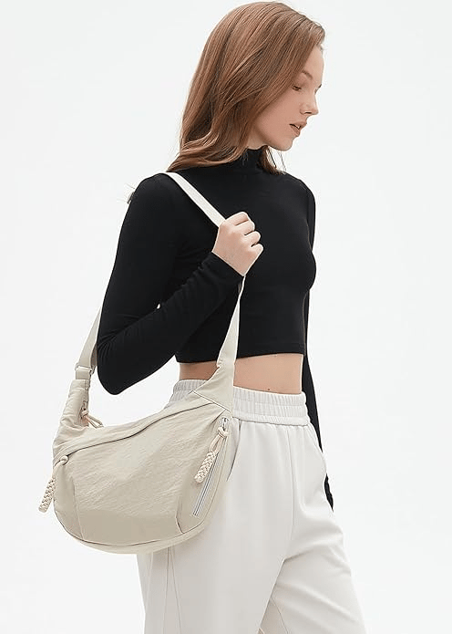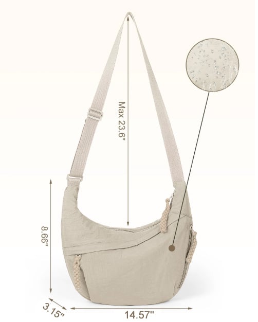 Perfekt storlek för vardagsbruk: Med en bredd på 37 cm, en höjd på 22 cm och en tjocklek på 8 cm erbjuder vår halvmåneformade nylonväska den perfekta balansen mellan rymlighet och elegant design för vardagsbruk. Med en justerbar axelrem som kan förlängas upp till 120 cm kan du enkelt växla mellan klassisk axelbärning och trendig crossbody-stil för ultimat mångsidighet och komfort.